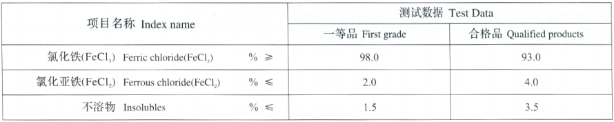 Ferric chloride solid is reddish brown and soluble in water. The aqueoussolution is acidic and has an oxidative corrosion effect on the metal.When ferricchloride is diluted with water, iron hydroxide precipitates after hydrolysis, which hasstrong cohesion.